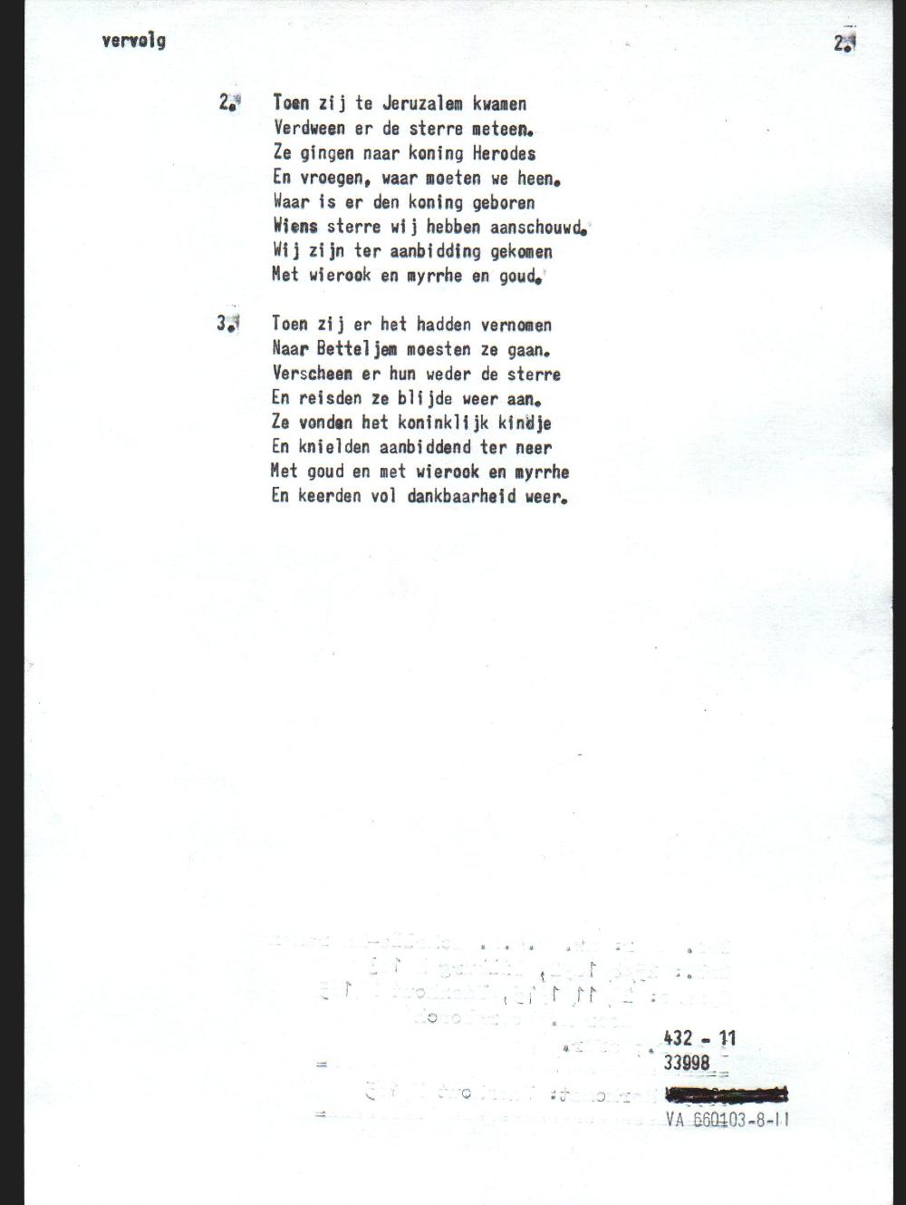 | Driekoningen zagen een sterre, Een sterre van wondere pracht. _ De sterre van Jacob, het teken, Zo lang aan den hemel verwacht. _ Ze repten zich heden geleiden, De ster die zij hadden aanschouwd. _ Naar het land van de joden met gif_ ten, Van wie rook en myrrhe en goud. _ | |